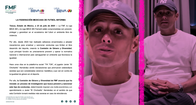 «Hace unos días en la plataforma social «TIK TOK», el jugador Javier «El Chicharito» Hernández emitió declaraciones que promueven estereotipos sexistas que son considerados violencia mediática y que van en contra de la igualdad de género en el deporte», explica la Federación en el comunicado que compartió en sus redes sociales.