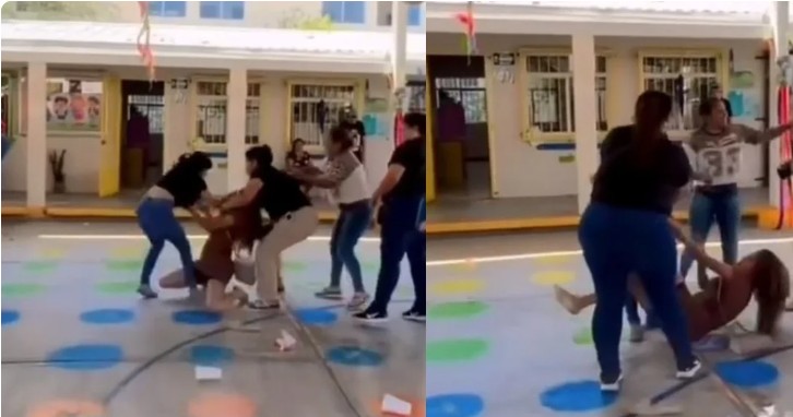 El video exhibe a dos personas, aparentemente madres jóvenes, que habrían comenzado la disputa y una de ellas terminó en el suelo con el cabello maltratado, mientras que otras tres mujeres intervinieron para separarlas pero también formaron parte de la pelea.