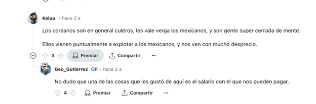 En Reddit, la plataforma masiva con 542 millones usuarios mensuales en donde los usuarios crean publicaciones que otros pueden comentar y/o votar, se encuentran decenas de relatos del terror que vivieron trabajadores mexicanos en plantas y fábricas surcoreanas en México.
