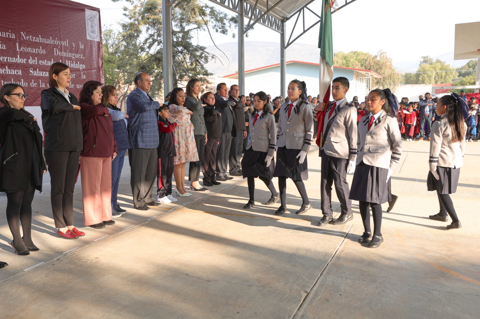 Durante la ceremonia del Lunes Cívico en la escuela primaria “Netzahualcóyotl”, el titular de la SEPH entregó la construcción del techado de la cancha de usos múltiples, obra que representó una inversión superior a 3.1 millones de pesos.