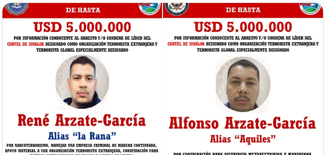 Ayúdenos a capturar a dos de los operadores más conocidos del Cartel de Sinaloa. Ofrecemos hasta $10 millones de dólares en recompensa por información conducente al arresto y/o condena de los jefes de la Plaza de Tijuana, René y Alfonso Arzate-García. https://t.co/Wjguh0wjBw pic.twitter.com/fYwgtI0uox