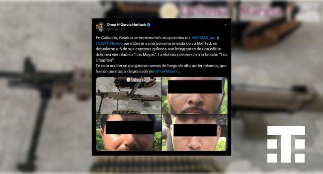 El secretario de Seguridad y Protección Ciudadana, Omar García Harfuch, informó la detención de cinco integrantes del grupo de «Los Mayos» en Culiacán, Sinaloa. Estas personas tenían privado de la libertad a un presunto integrante de «Los Chapitos», quien fue liberado.