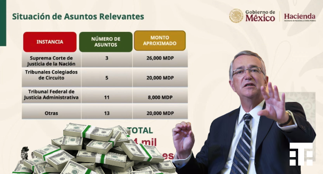 Detalló que Grupo Salinas tiene 32 juicios, tan solo los juicios en la Suprema Corte de Justicia suman más de 26 mil millones de pesos, cinco juicios delicados en tribunales colegiados de circuito con más de 20 mil millones de pesos y en el Tribunal Federal de Justicia Administrativa, que es la primera instancia antes de llegar a los tribunales colegiados, 11 juicios con 8 mil millones de pesos.