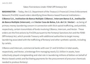 La Secretaría de Hacienda y Crédito Público (SHCP) detalló que la Comisión Nacional Bancaria y de Valores ya inició un proceso de revisión a las instituciones bancarias CIBanco, Vector e Intercam luego de que el Departamento del Tesoro del gobierno de Estados Unidos estableció sanciones administrativas y civiles a dos bancos mexicanos y una casa de bolsa, por presunto lavado de dinero y vínculos con la delincuencia organizada, específicamente con el Cartel de Sinaloa.