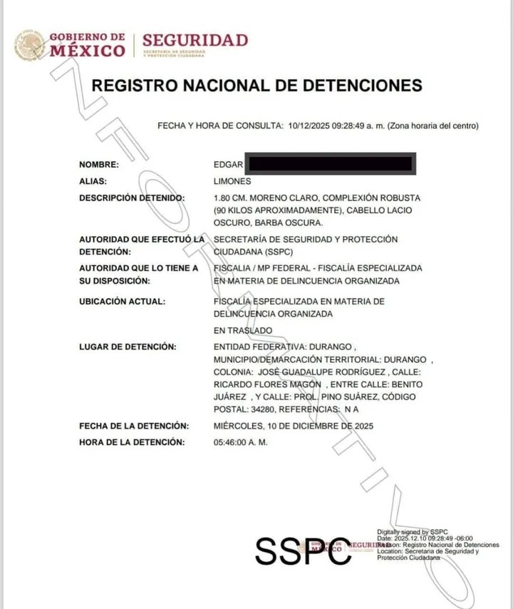 Resultado de labores de inteligencia, y de seguridad, autoridades lograron la detención en Durango de Edgar “N”, alias “Limones”, identificado como integrante de la organización criminal Los Cabrera.