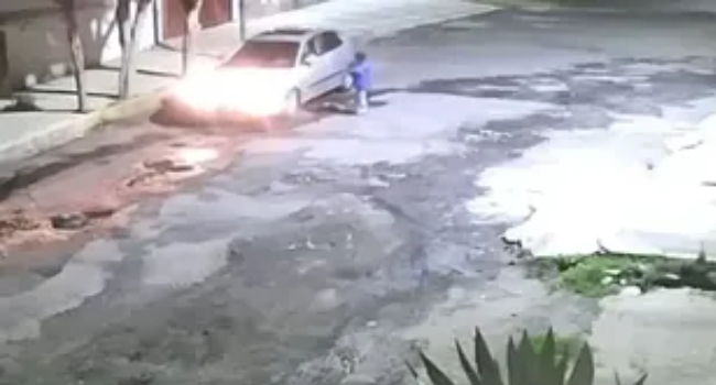 El niño al ver que el hombre que va en el auto no se detiene, lo persigue unos metros más adelante, pero el vehículo acelera y se va, dejando al pequeño en la calle.