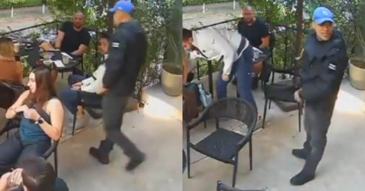 Con un arma de fuego en mano, el asaltante apunta a un joven vestido de blanco, a quien le quita un reloj. Posteriormente, el ladrón solicita al consumidor retirarle un accesorio de la mano a una de las chicas de la misma mesa, quien entra en crisis tras el atraco.