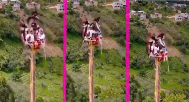 De acuerdo con un video difundido en redes sociales y captado por un dron, se observa cómo uno de los danzantes que lideraba el ritual desde lo alto del mástil pierde el equilibrio repentinamente, al parecer por una fuerte ráfaga de viento.