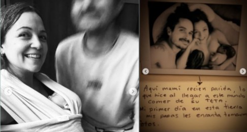 en una de las imágenes muestra a Natalia amamantando a su pequeño tras dar a luz, con un mensaje. “Aquí mami recién parida, lo primero que hice al nacer fue comer de su teta. Mi primer día en esta tierra, a mis papás les encanta tomarme fotos”.