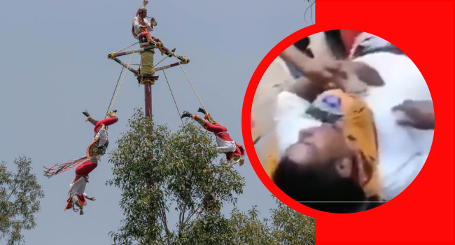 A través de redes sociales circula un video en el que se capta el momento exacto en el cinco danzantes de los Voladores de Papantla cayeron de más de 10 metros de altura mientras realizaban el ritual, luego de que el palo del que colgaban colapsara.